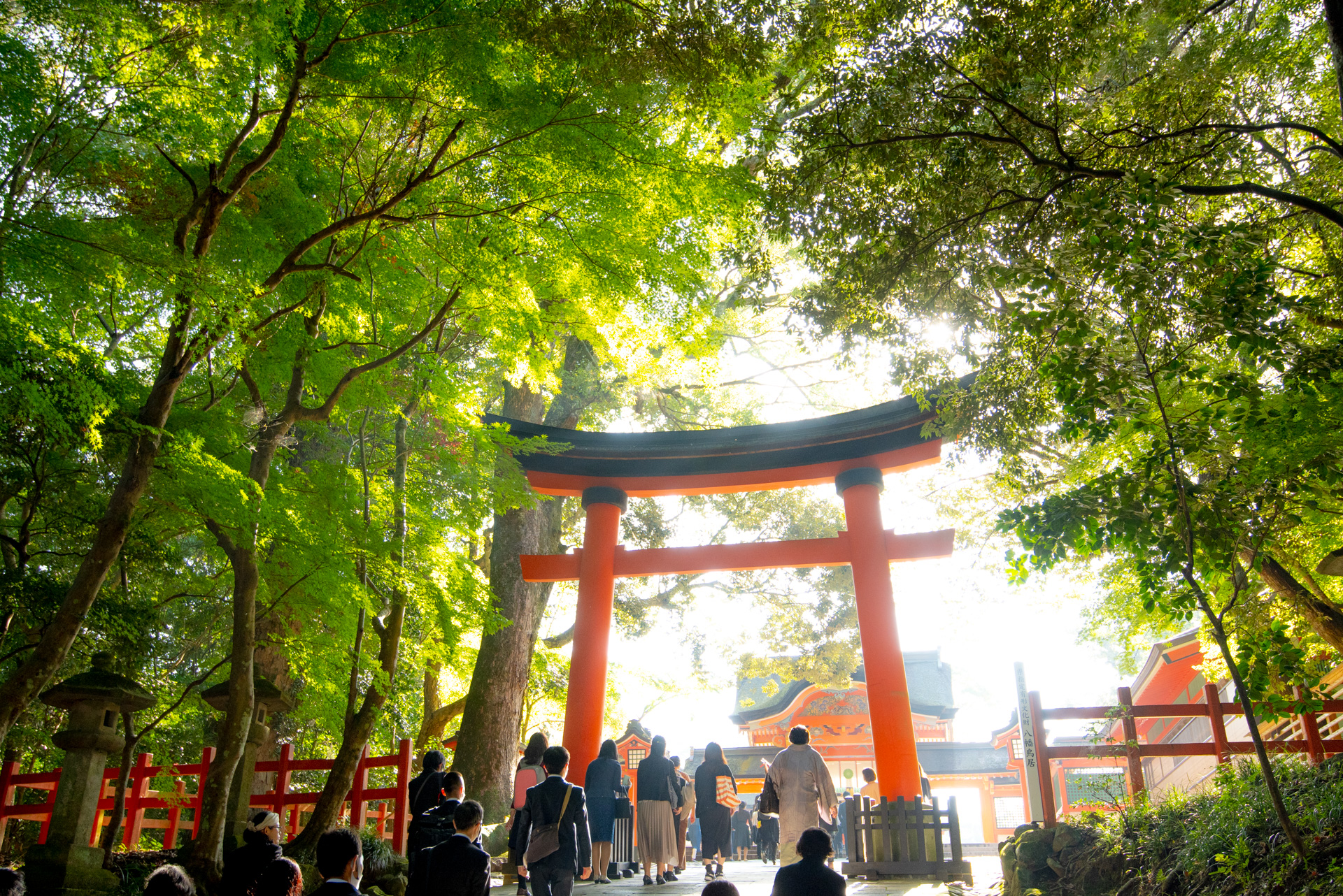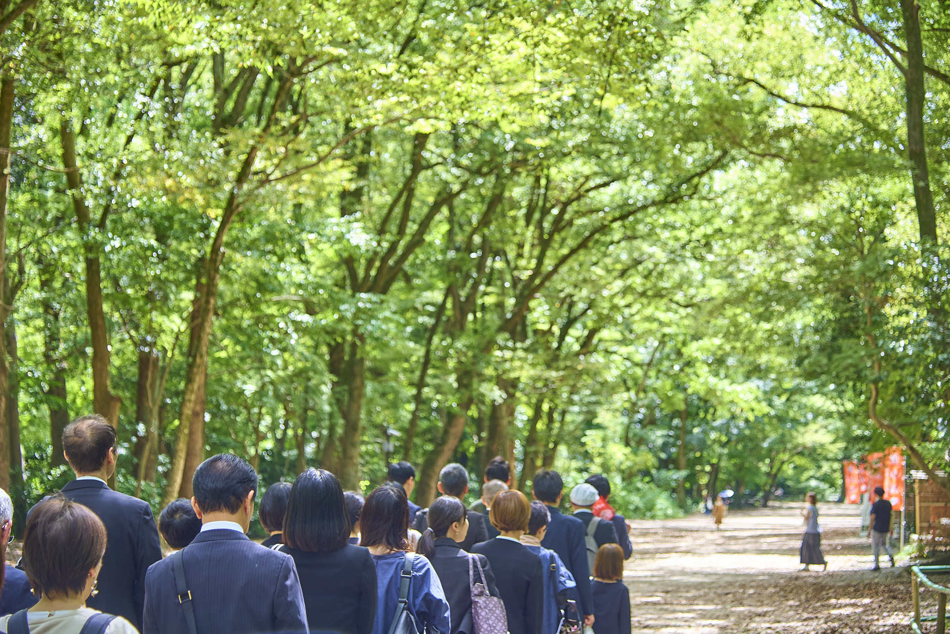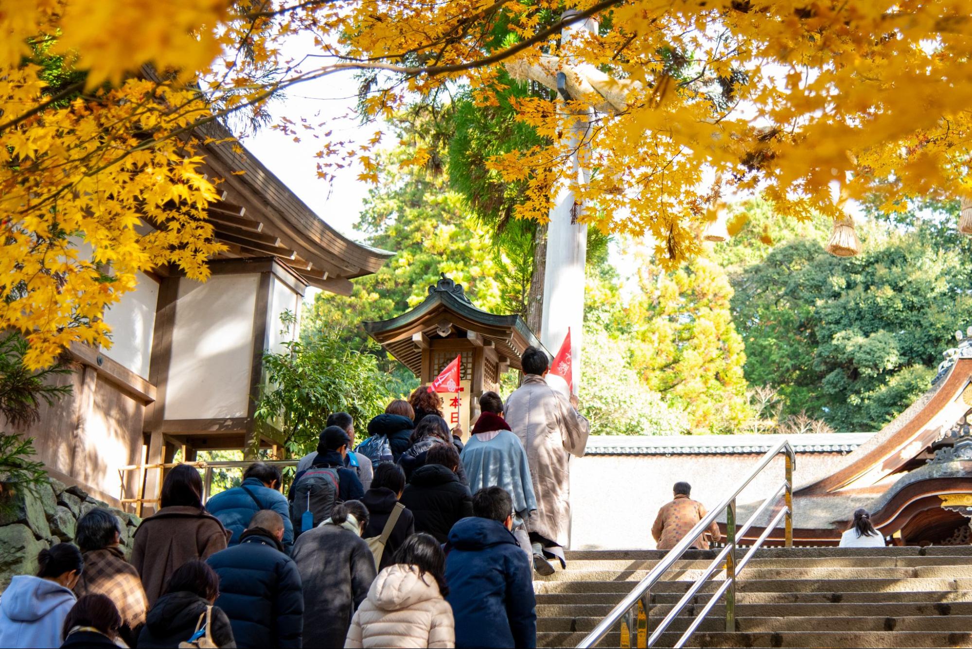 神様へ敬意を表し、礼を尽くす場ですので、落ち着いた色のスーツやそれに準ずる正装でお越しください。また、参拝では歩く場面も多いため、履き慣れた歩きやすい靴をご用意ください。